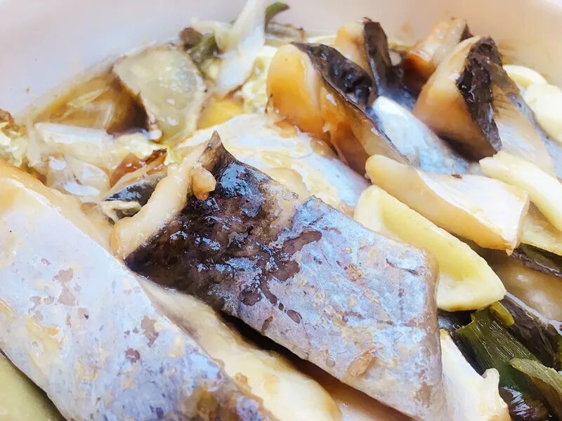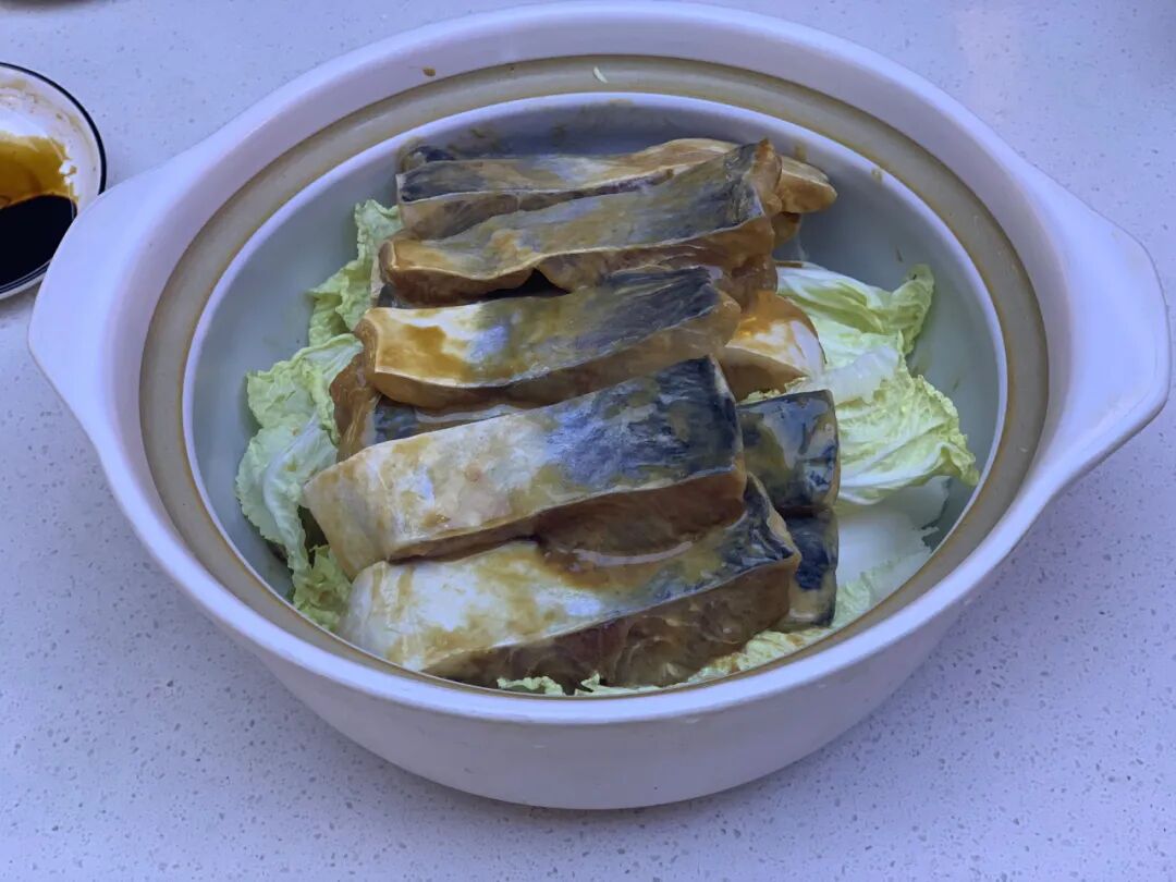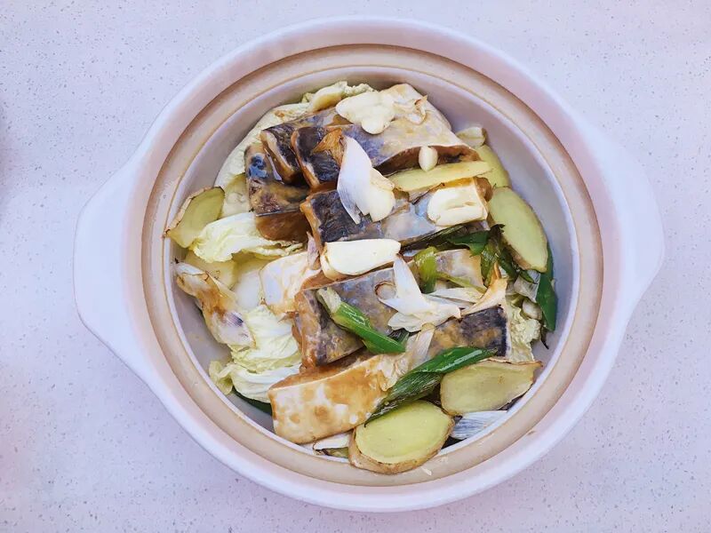4.准备砂锅一个,将爆香好的部分葱姜蒜放入砂锅底部,铺上一层娃娃菜,再将腌制好的鱼肉放在上面。