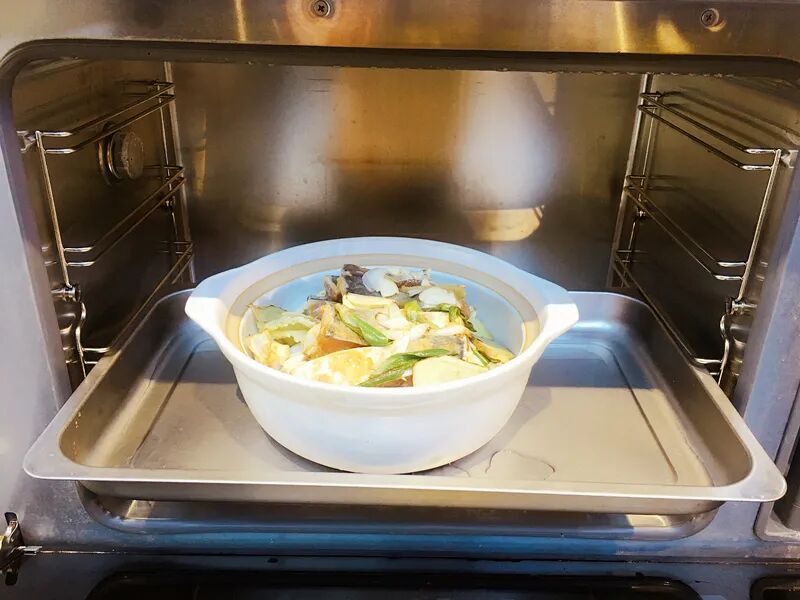 6.将砂锅放入蒸箱中,用火星人集成灶蒸制40分钟。模式:蒸煮模式→温度:100度→时间:40分钟→开始!