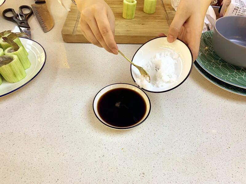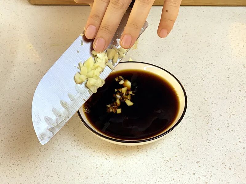 5.调制料汁:适量蒸鱼豉油,加入糖,蒜泥。