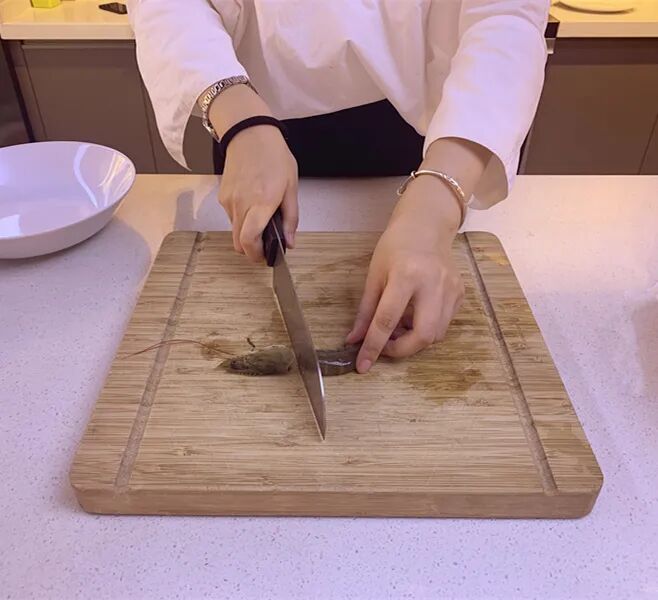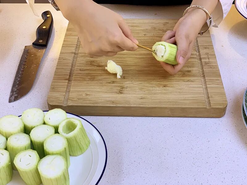 1.丝瓜切成小段,用刀挖掉一部分瓤,做成丝瓜盅。