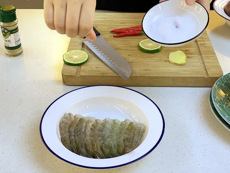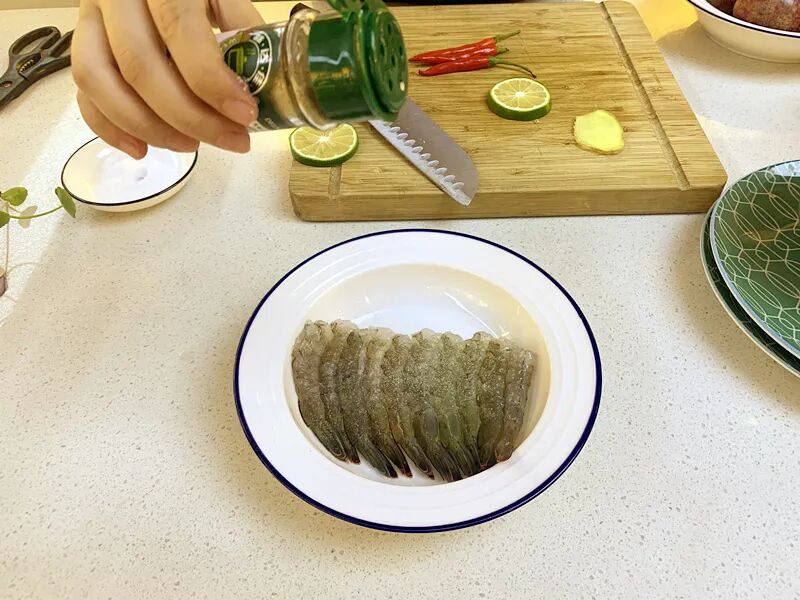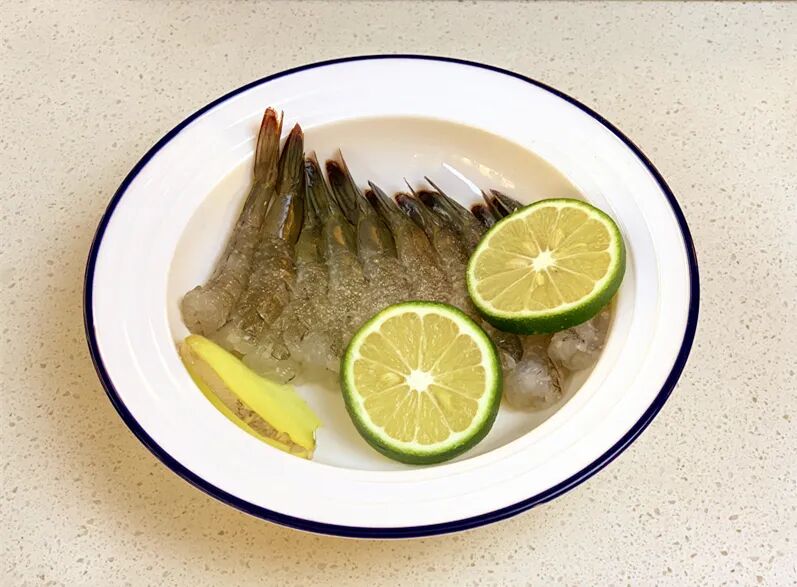 3.处理好的鲜虾加适量盐,糖,胡椒粉,生姜,柠檬片腌制15分钟。