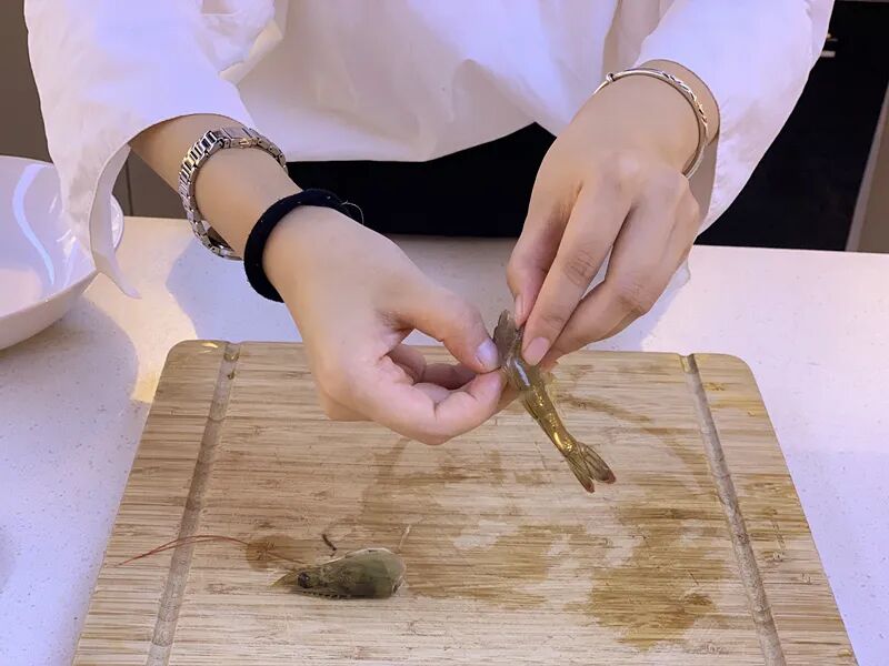2.将基围虾去头,挑去虾线,剥去虾身上的壳只保留末尾那一小节。