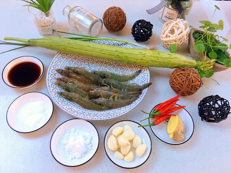 准备食材:丝瓜,基围虾,蒜,生姜,柠檬