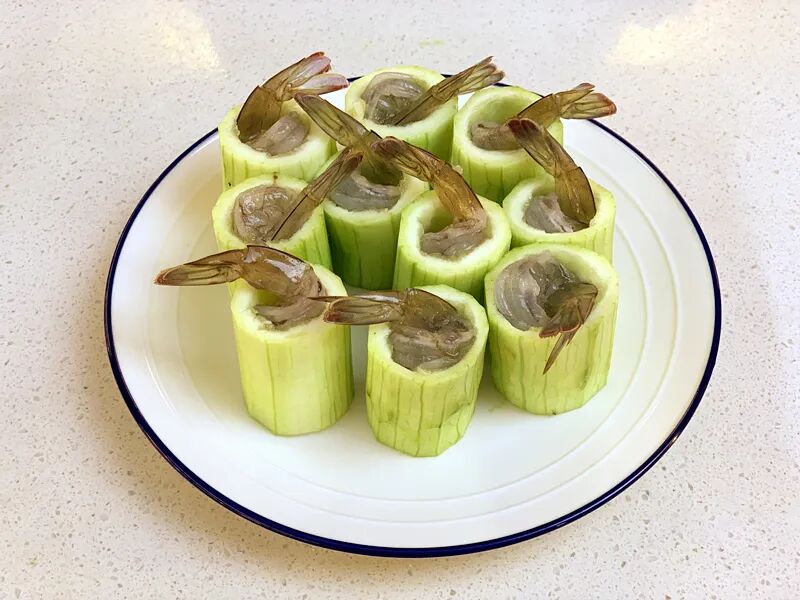 4.将腌制好的鲜虾做成虾球放入丝瓜盅。
